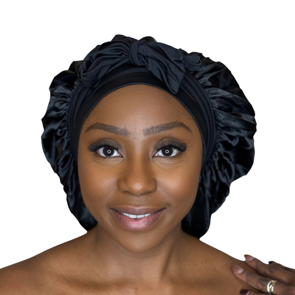 Satin Hair Bonnet with straps - Black ( Satin Night sleep cap )