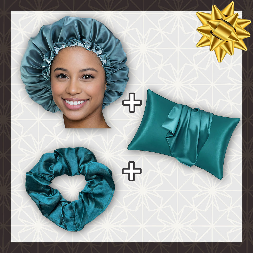 SATIN SET - Protect your hair & skin - Teal Hair Bonnet + Satin Pillowcase + Scrunchie