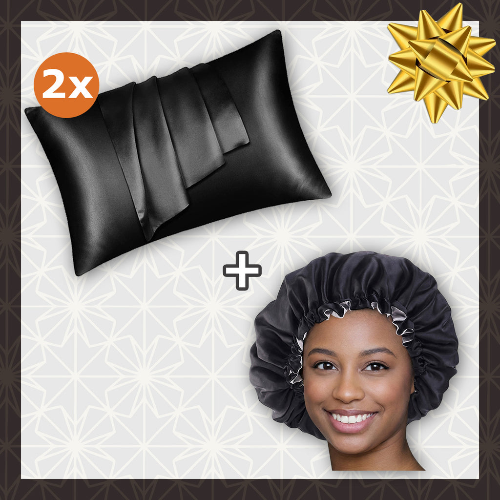 SATIN SET - Protect your hair & skin - Black Satin Hair Bonnet + 2 x Satin Pillowcase