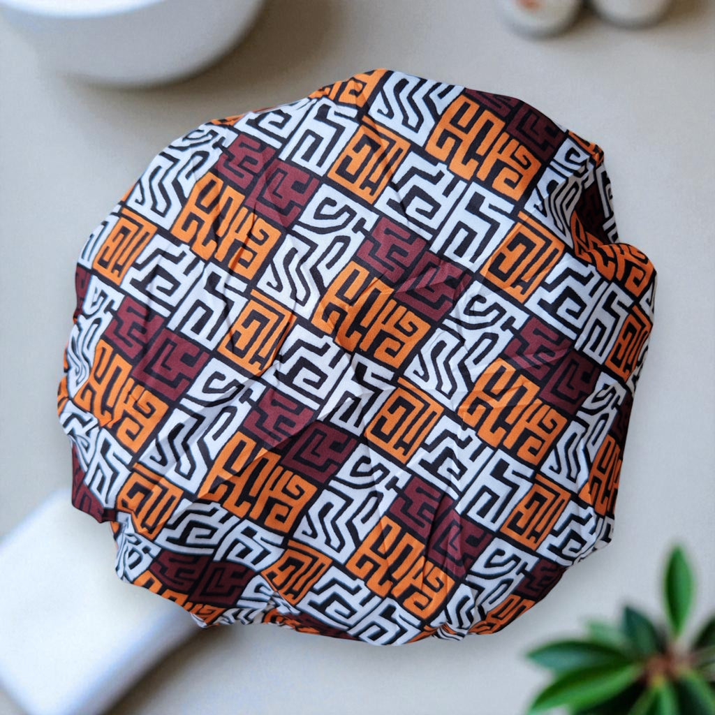 LARGE Shower cap for full hair / curls - African print Brown & Yellow-Orange Kuba Blocks Congo